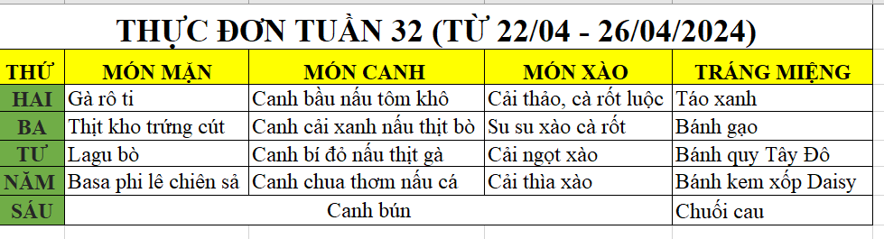 THỰC ĐƠN BÁN TRÚ TỪ 22.4 ĐẾN 26.4.2024